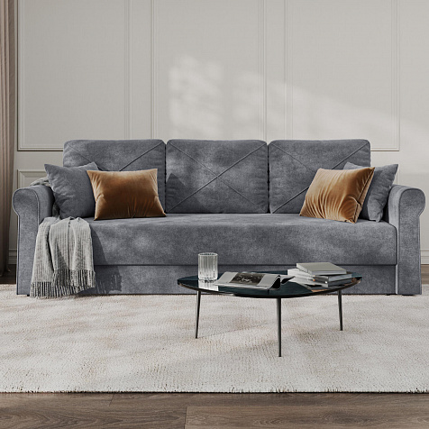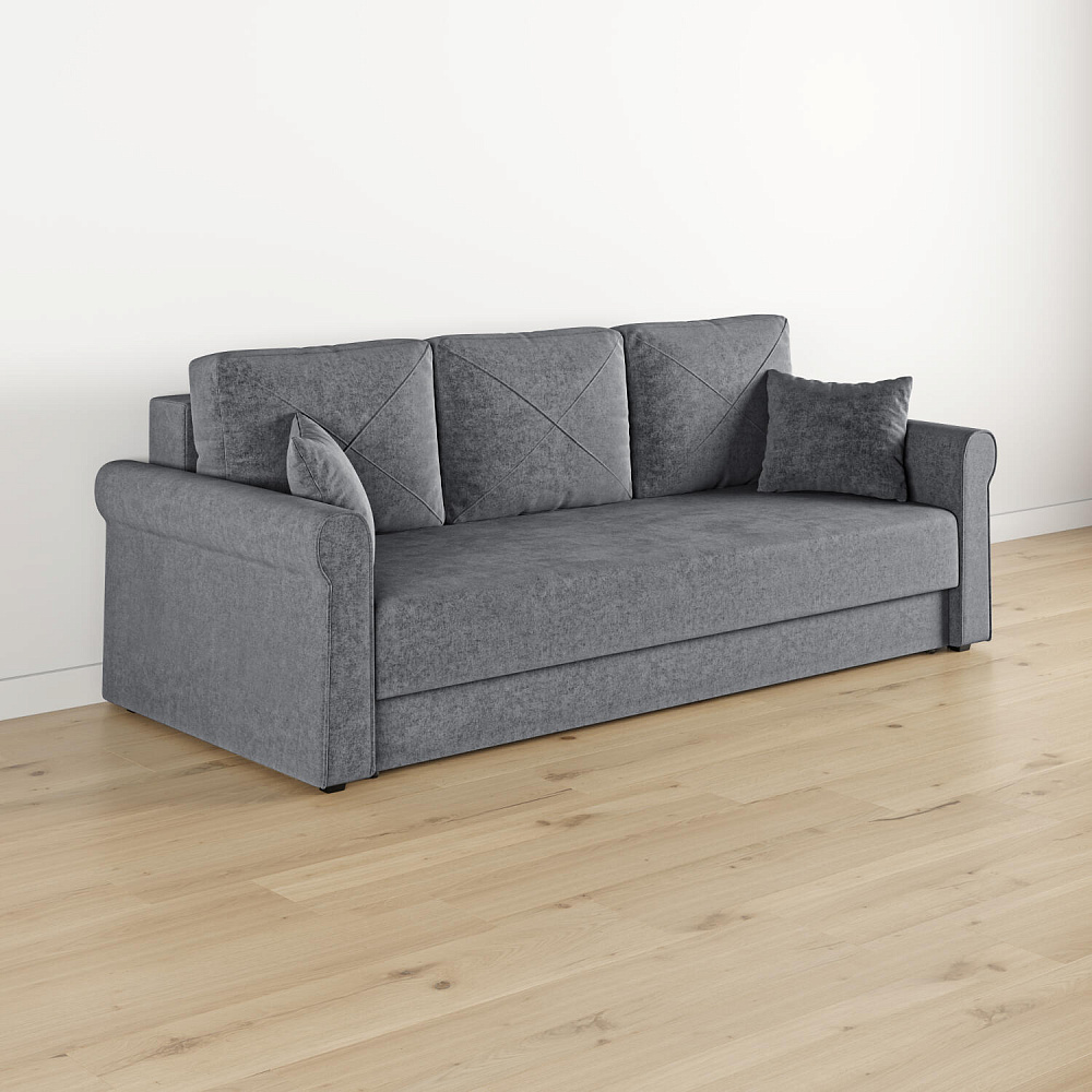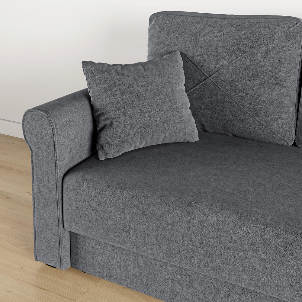- Механизм трансформации «Еврокнижка». Диван легко раскладывается — достаточно выкатить вперёд сиденье и опустить спинку. Отодвигать диван от стены не требуется.