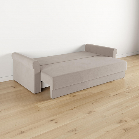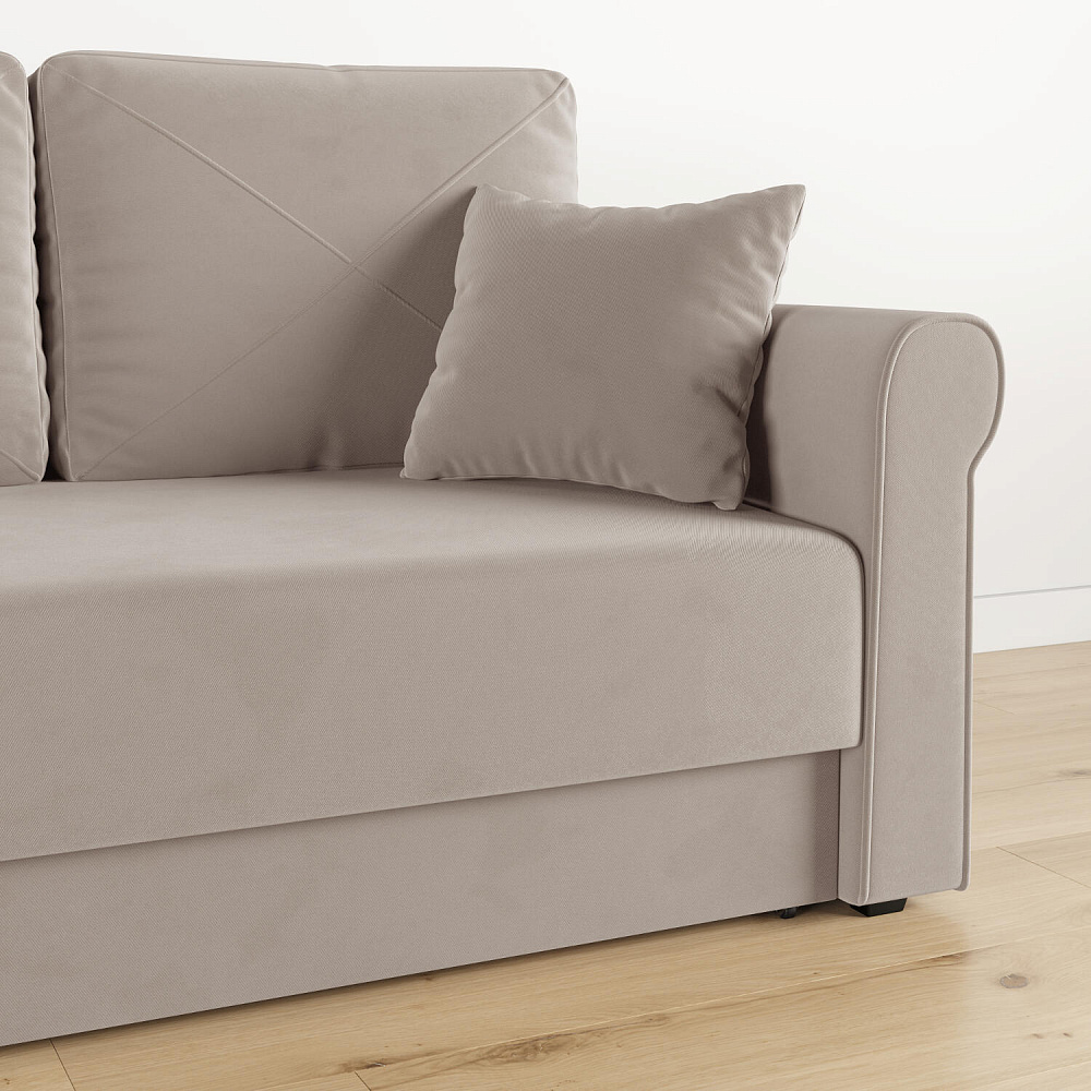 - Механизм трансформации «Еврокнижка». Диван легко раскладывается — достаточно выкатить вперёд сиденье и опустить спинку. Отодвигать диван от стены не требуется.