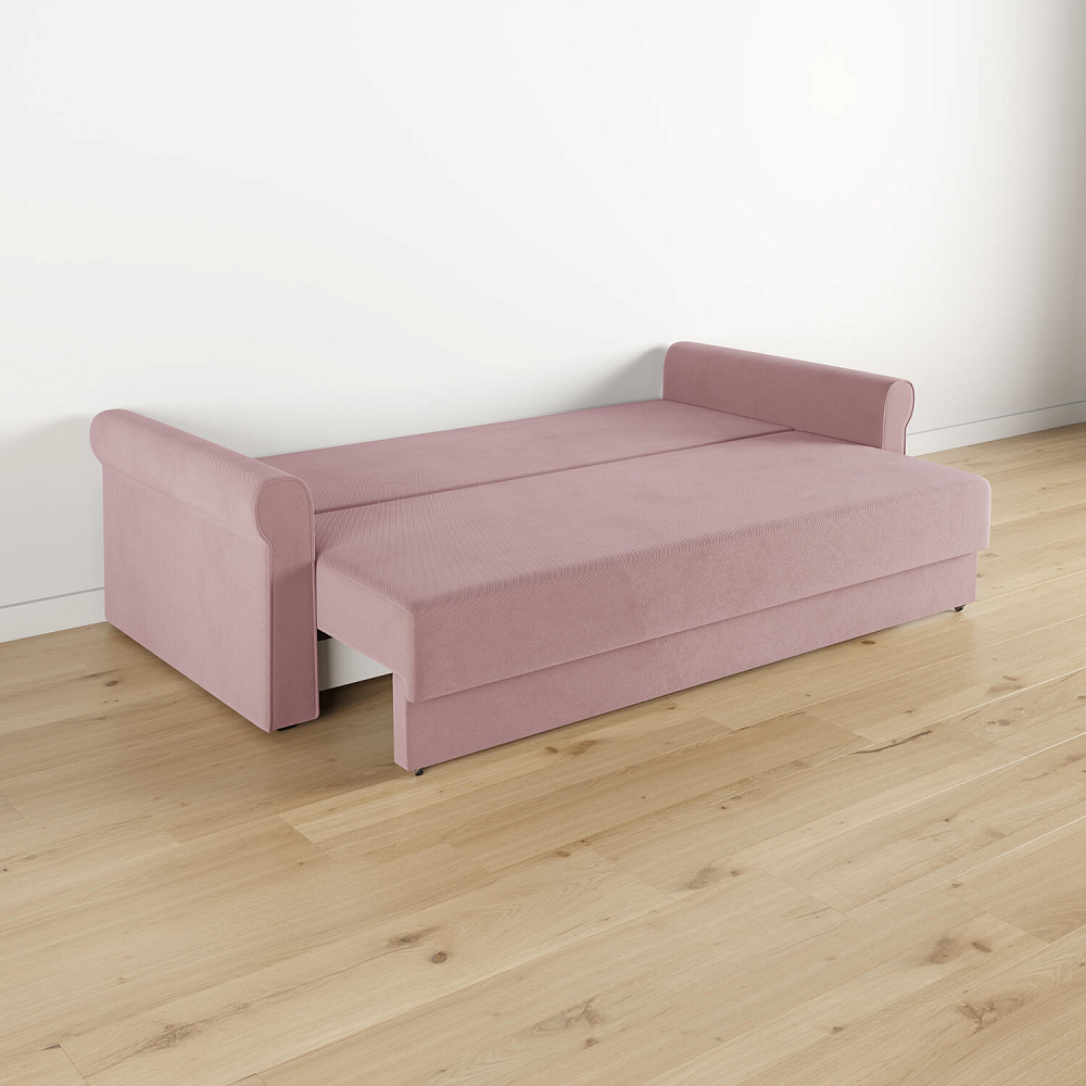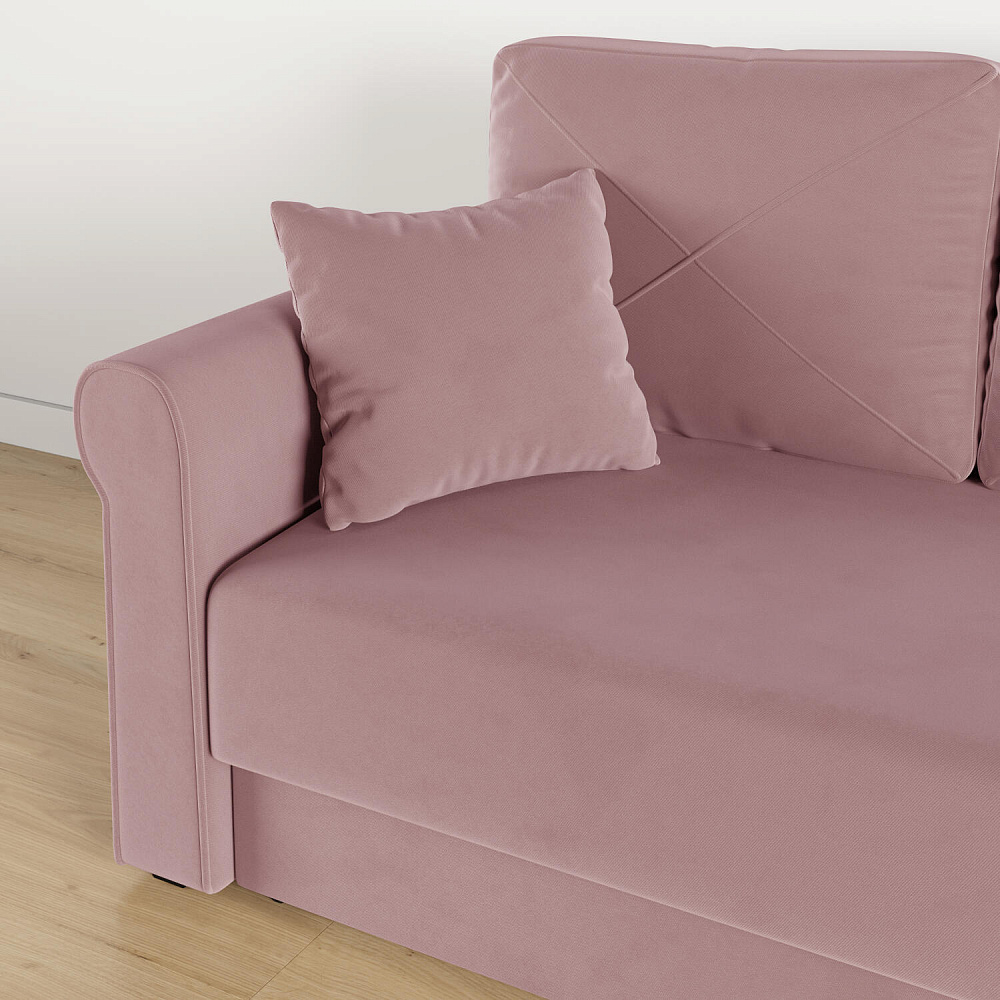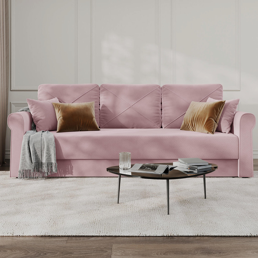 - Механизм трансформации «Еврокнижка». Диван легко раскладывается — достаточно выкатить вперёд сиденье и опустить спинку. Отодвигать диван от стены не требуется.