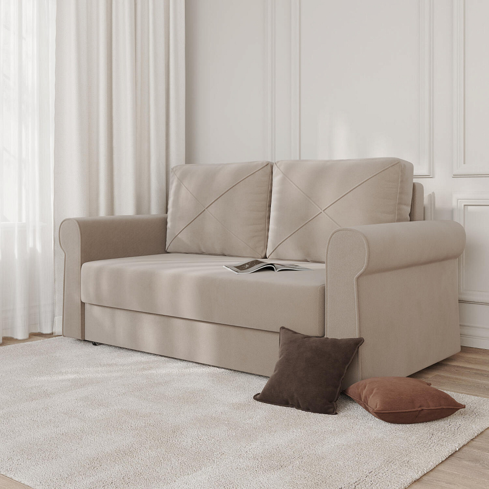 Двухместный диван «Имола» объединяет строгие геометрические формы и мягкую воздушность. Спинка выполнена в той же обивке, что и основная часть, что даёт возможность использовать диван для зонирования комнаты. Механизм трансформации «Еврокнижка» обеспечивает комфортное и ровное спальное место.