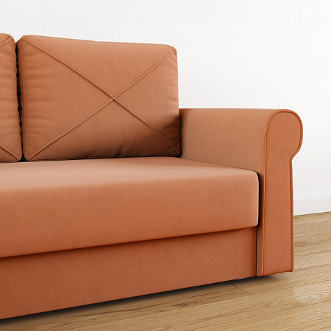 - Механизм трансформации «Еврокнижка». Диван легко раскладывается — нужно выкатить вперёд сиденье и опустить спинку, при этом отодвигать сам диван от стены не требуется.