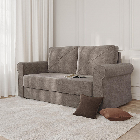 Двухместный диван «Имола» объединяет строгие геометрические формы и мягкую воздушность. Спинка выполнена в той же обивке, что и основная часть, что даёт возможность использовать диван для зонирования комнаты. Механизм трансформации «Еврокнижка» обеспечивает комфортное и ровное спальное место.