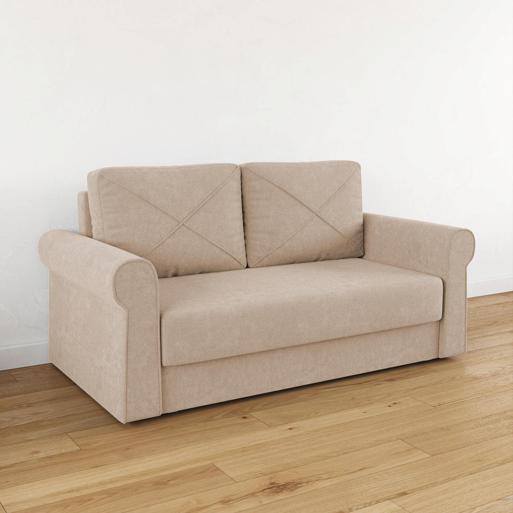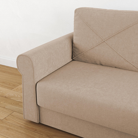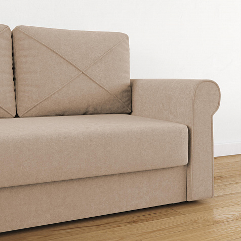 - Механизм трансформации «Еврокнижка». Диван легко раскладывается — нужно выкатить вперёд сиденье и опустить спинку, при этом отодвигать сам диван от стены не требуется.