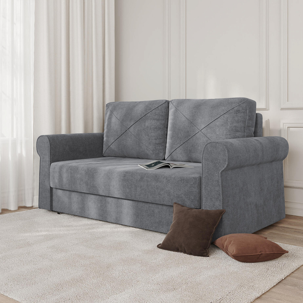Двухместный диван «Имола» объединяет строгие геометрические формы и мягкую воздушность. Спинка выполнена в той же обивке, что и основная часть, что даёт возможность использовать диван для зонирования комнаты. Механизм трансформации «Еврокнижка» обеспечивает комфортное и ровное спальное место.