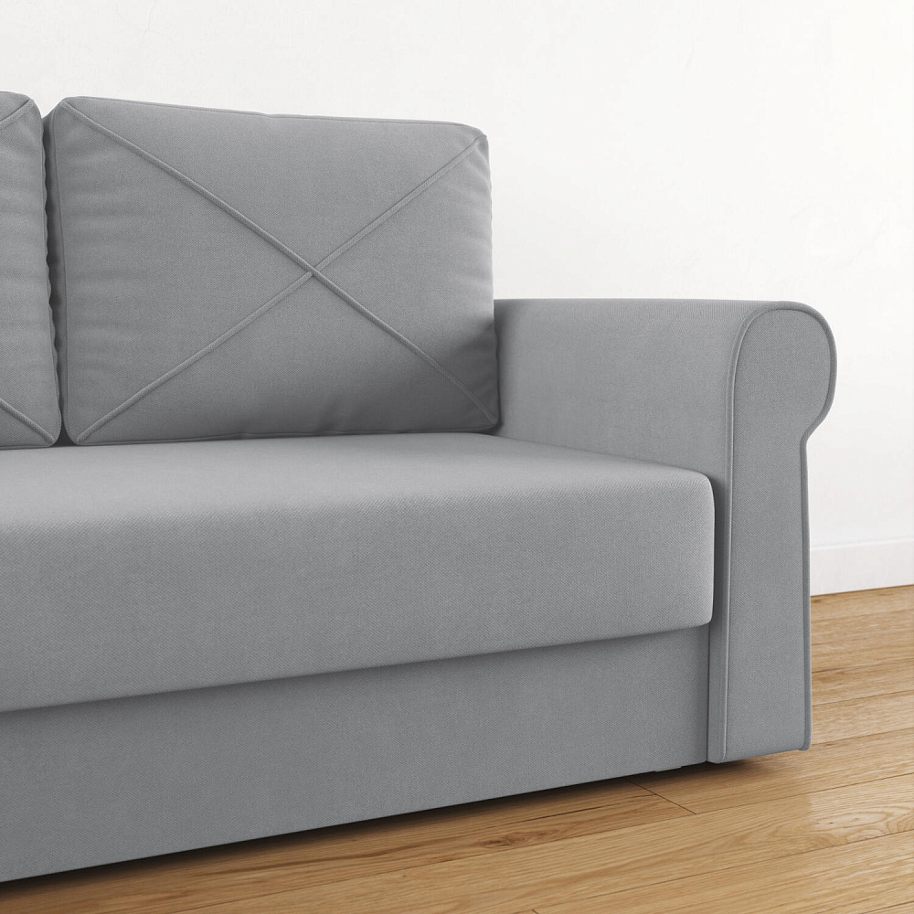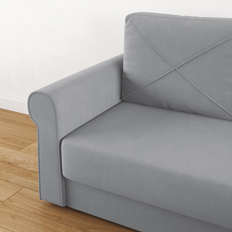 - Механизм трансформации «Еврокнижка». Диван легко раскладывается — нужно выкатить вперёд сиденье и опустить спинку, при этом отодвигать сам диван от стены не требуется.
