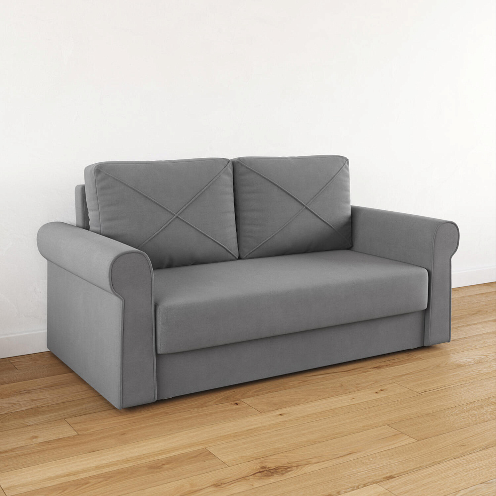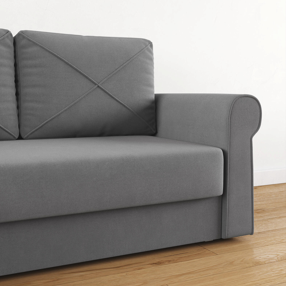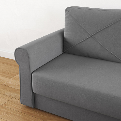 - Механизм трансформации «Еврокнижка». Диван легко раскладывается — нужно выкатить вперёд сиденье и опустить спинку, при этом отодвигать сам диван от стены не требуется.