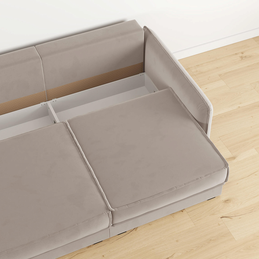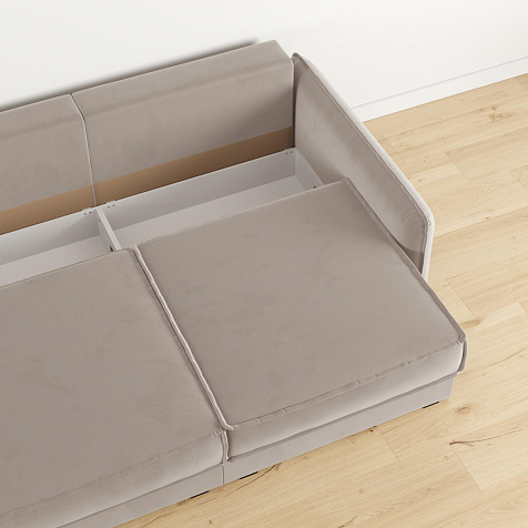 - Механизм трансформации «Тик-Так» секционный. Части дивана раскладываются независимо друг от друга. Напольное покрытие останется целым — механизм выталкивает сиденье вверх, которое словно шагает вперёд, не касаясь пола.