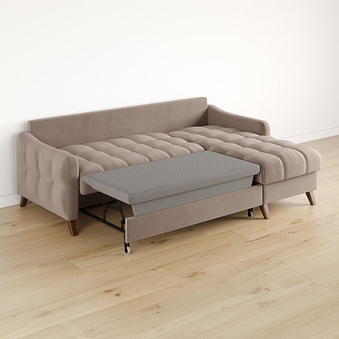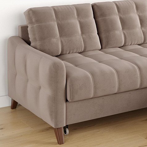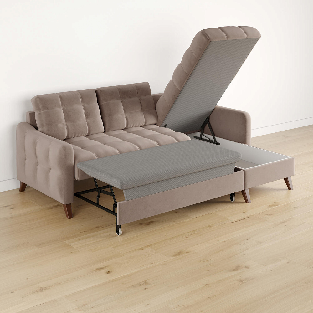 Механизм трансформации «Дельфин». Диван легко и быстро превращается в кровать. Выдвиньте раму с дополнительным спальным местом из-под более широкой части дивана, потяните вверх и вперёд за специальные петли. Подушка поднимется на уровень остальных частей дивана. Подушка выполнена в технической ткани, отличается от обивки по цвету и фактуре.