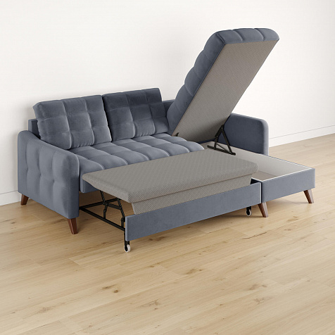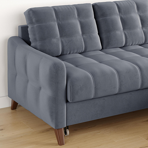 Механизм трансформации «Дельфин». Диван легко и быстро превращается в кровать. Выдвиньте раму с дополнительным спальным местом из-под более широкой части дивана, потяните вверх и вперёд за специальные петли. Подушка поднимется на уровень остальных частей дивана. Подушка выполнена в технической ткани, отличается от обивки по цвету и фактуре.