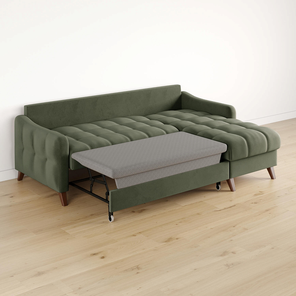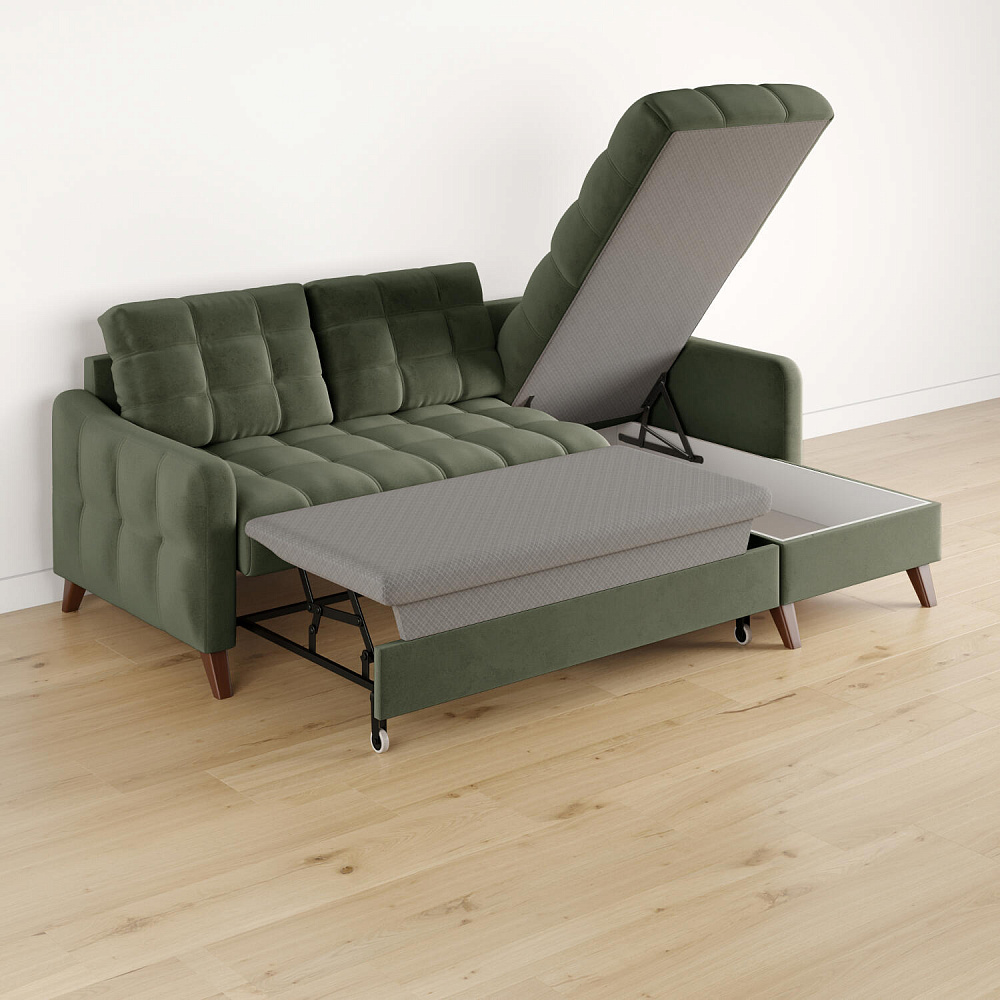 Механизм трансформации «Дельфин». Диван легко и быстро превращается в кровать. Выдвиньте раму с дополнительным спальным местом из-под более широкой части дивана, потяните вверх и вперёд за специальные петли. Подушка поднимется на уровень остальных частей дивана. Подушка выполнена в технической ткани, отличается от обивки по цвету и фактуре.