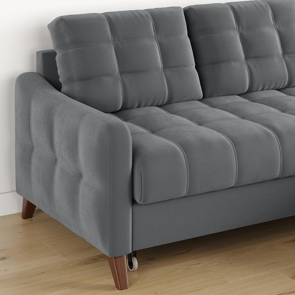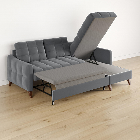 Механизм трансформации «Дельфин». Диван легко и быстро превращается в кровать. Выдвиньте раму с дополнительным спальным местом из-под более широкой части дивана, потяните вверх и вперёд за специальные петли. Подушка поднимется на уровень остальных частей дивана. Подушка выполнена в технической ткани, отличается от обивки по цвету и фактуре.