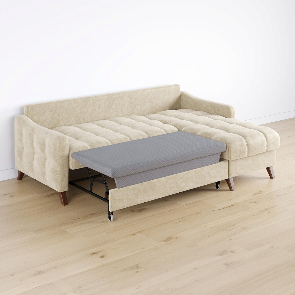 Механизм трансформации «Дельфин». Диван легко и быстро превращается в кровать. Выдвиньте раму с дополнительным спальным местом из-под более широкой части дивана, потяните вверх и вперёд за специальные петли. Подушка поднимется на уровень остальных частей дивана. Подушка выполнена в технической ткани, отличается от обивки по цвету и фактуре.