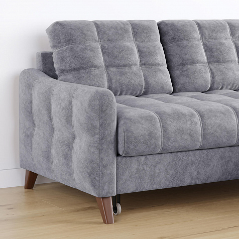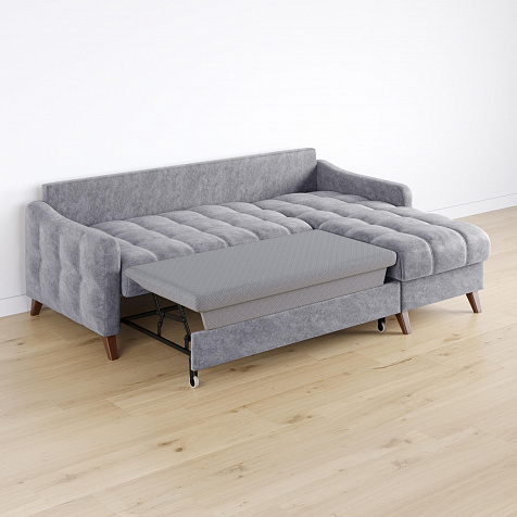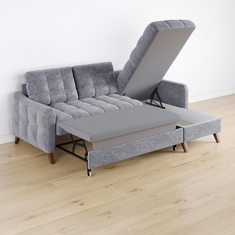 Механизм трансформации «Дельфин». Диван легко и быстро превращается в кровать. Выдвиньте раму с дополнительным спальным местом из-под более широкой части дивана, потяните вверх и вперёд за специальные петли. Подушка поднимется на уровень остальных частей дивана. Подушка выполнена в технической ткани, отличается от обивки по цвету и фактуре.