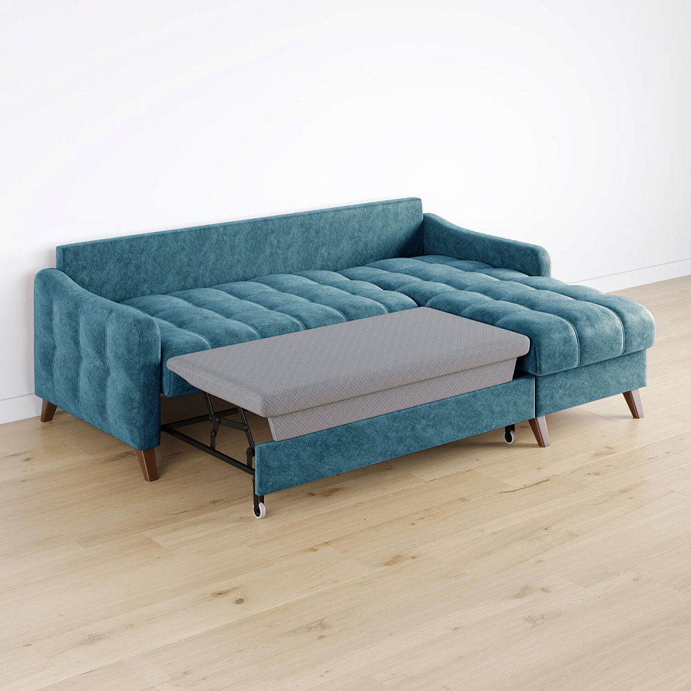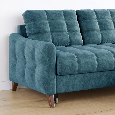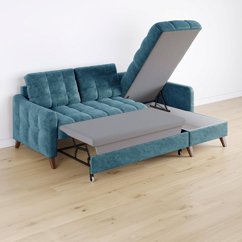 Механизм трансформации «Дельфин». Диван легко и быстро превращается в кровать. Выдвиньте раму с дополнительным спальным местом из-под более широкой части дивана, потяните вверх и вперёд за специальные петли. Подушка поднимется на уровень остальных частей дивана. Подушка выполнена в технической ткани, отличается от обивки по цвету и фактуре.