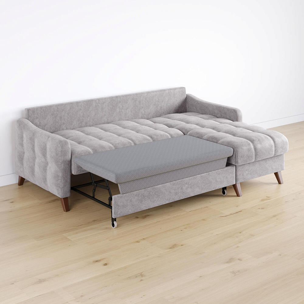 Механизм трансформации «Дельфин». Диван легко и быстро превращается в кровать. Выдвиньте раму с дополнительным спальным местом из-под более широкой части дивана, потяните вверх и вперёд за специальные петли. Подушка поднимется на уровень остальных частей дивана. Подушка выполнена в технической ткани, отличается от обивки по цвету и фактуре.