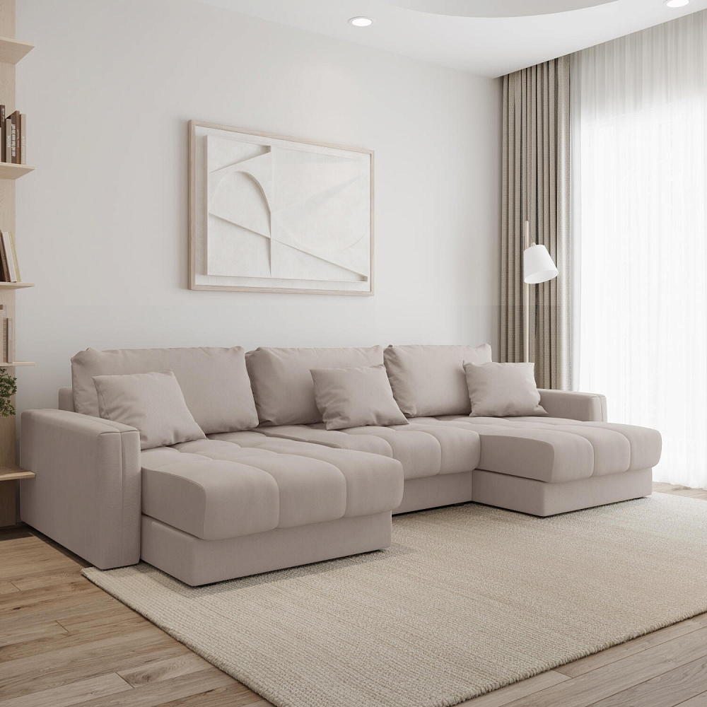 П-образный угловой диван «Дензел» — лучший вариант для ценителей комфорта и удобства в сочетании со стильным дизайном. Диван обладает глубокой посадкой, а приспинные и декоративные подушки позволят создать удобное место для отдыха. Угловая модель с двумя оттоманками займёт своё идеальное место в пространстве комнаты или студии. Спинка модели выполнена в обивочной ткани, что даёт возможность использовать диван для зонирования комнаты.