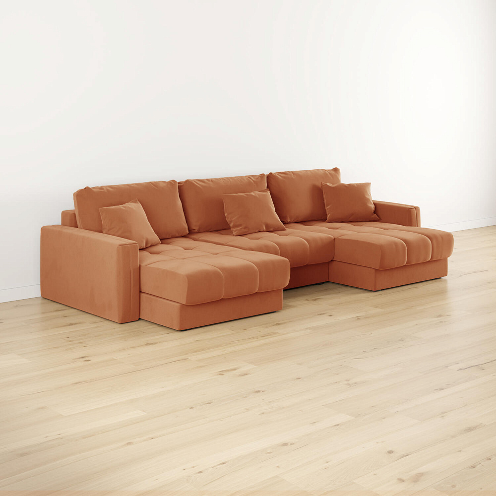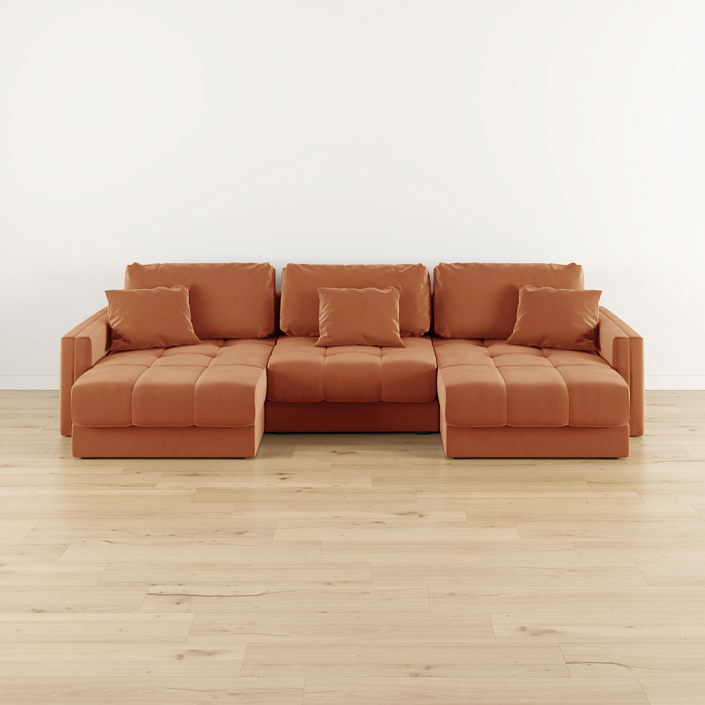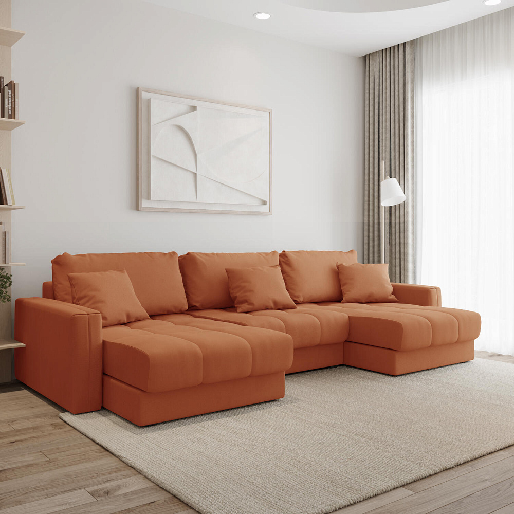 П-образный угловой диван «Дензел» — лучший вариант для ценителей комфорта и удобства в сочетании со стильным дизайном. Диван обладает глубокой посадкой, а приспинные и декоративные подушки позволят создать удобное место для отдыха. Угловая модель с двумя оттоманками займёт своё идеальное место в пространстве комнаты или студии. Спинка модели выполнена в обивочной ткани, что даёт возможность использовать диван для зонирования комнаты.