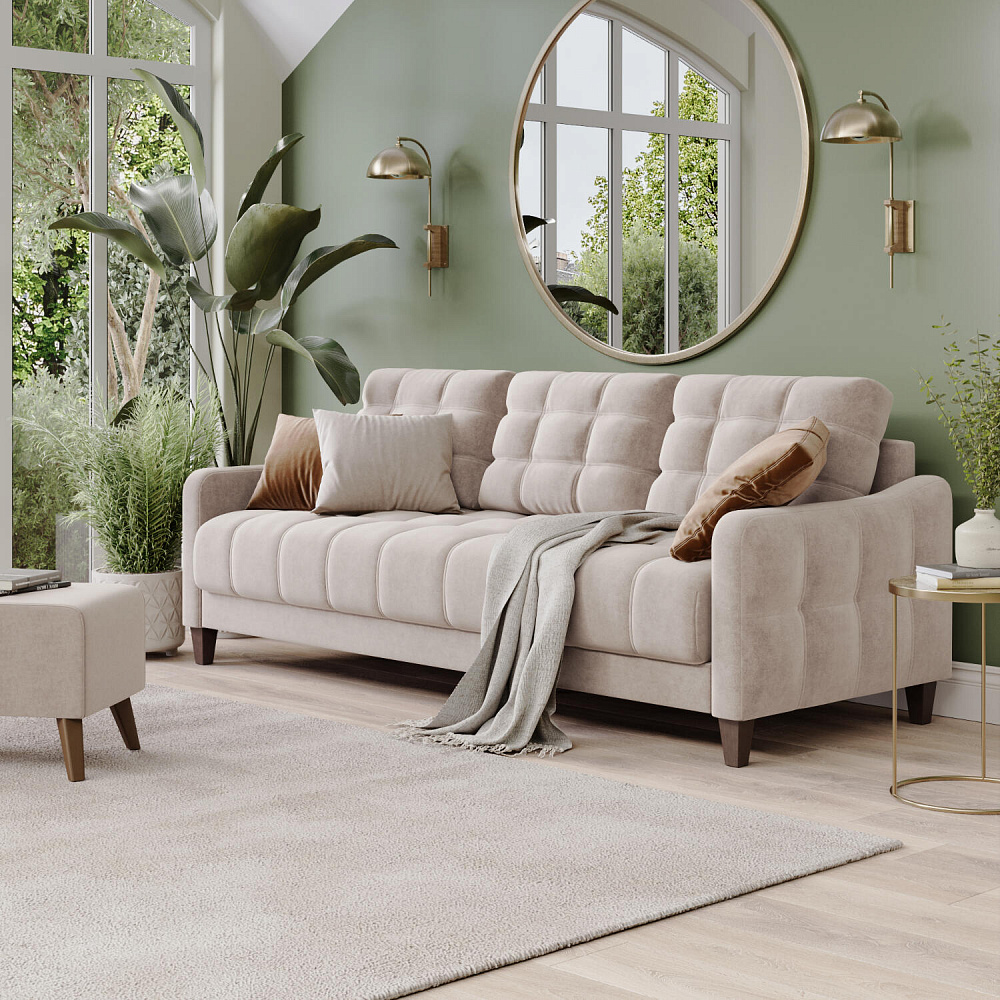 Диван «Бремен» в популярном скандинавском стиле станет функциональным и стильным местом отдыха в доме. Диван с глубокой посадкой оснащён механизмом трансформации и большим бельевым коробом. Высокие опоры и однотонная обивка натурального оттенка добавят в комнату воздуха и лёгкости.