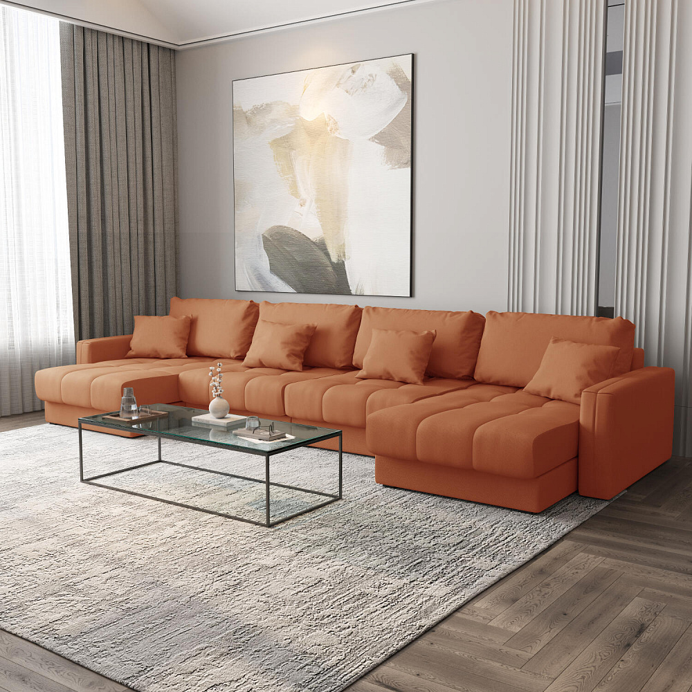 П-образный угловой диван «Дензел» — лучший вариант для ценителей комфорта и удобства в сочетании со стильным дизайном. Диван обладает глубокой посадкой, а приспинные и декоративные подушки позволят создать удобное место для отдыха. Угловая модель с двумя оттоманками займёт своё идеальное место в пространстве комнаты или студии. Спинка модели выполнена в обивочной ткани, что даёт возможность использовать диван для зонирования комнаты.