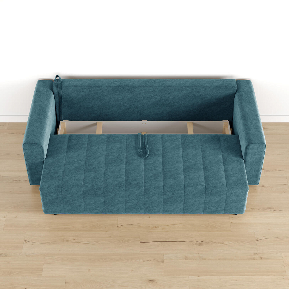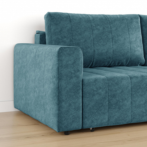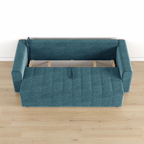 Механизм трансформации «Еврокнижка». Диван легко раскладывается — нужно выкатить вперед сиденье и опустить спинку. Удобен механизм ещё тем, что двигается только передняя часть, поэтому отодвигать диван от стены не требуется.