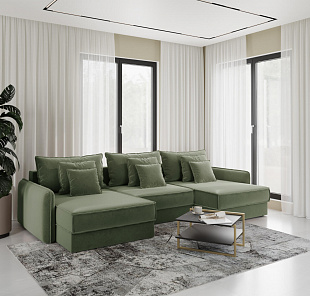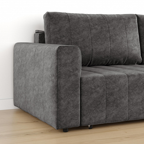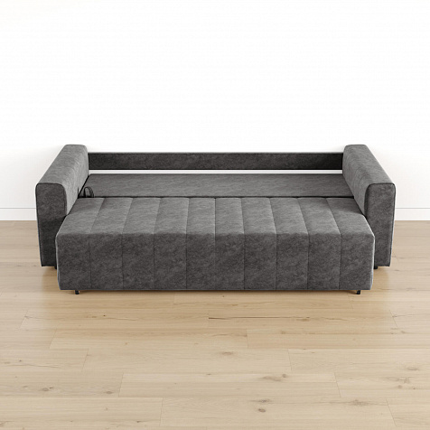 Механизм трансформации «Еврокнижка». Диван легко раскладывается — нужно выкатить вперед сиденье и опустить спинку. Удобен механизм ещё тем, что двигается только передняя часть, поэтому отодвигать диван от стены не требуется.