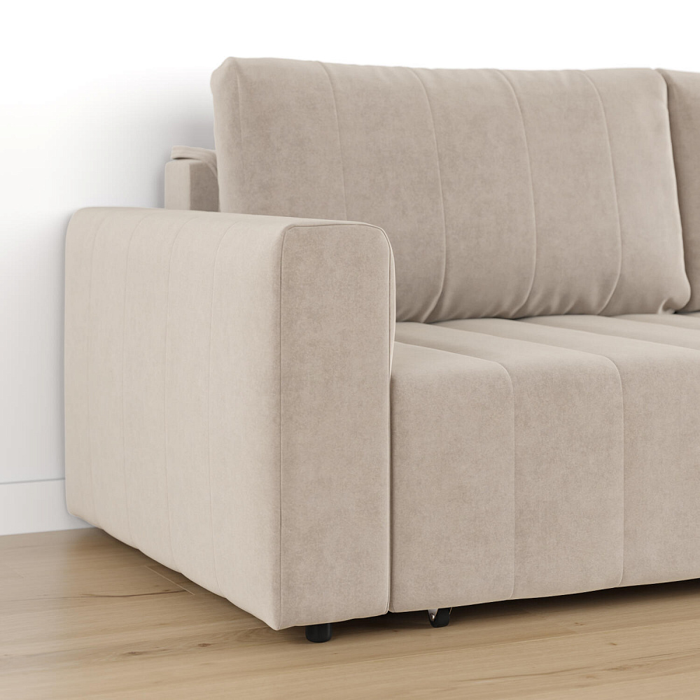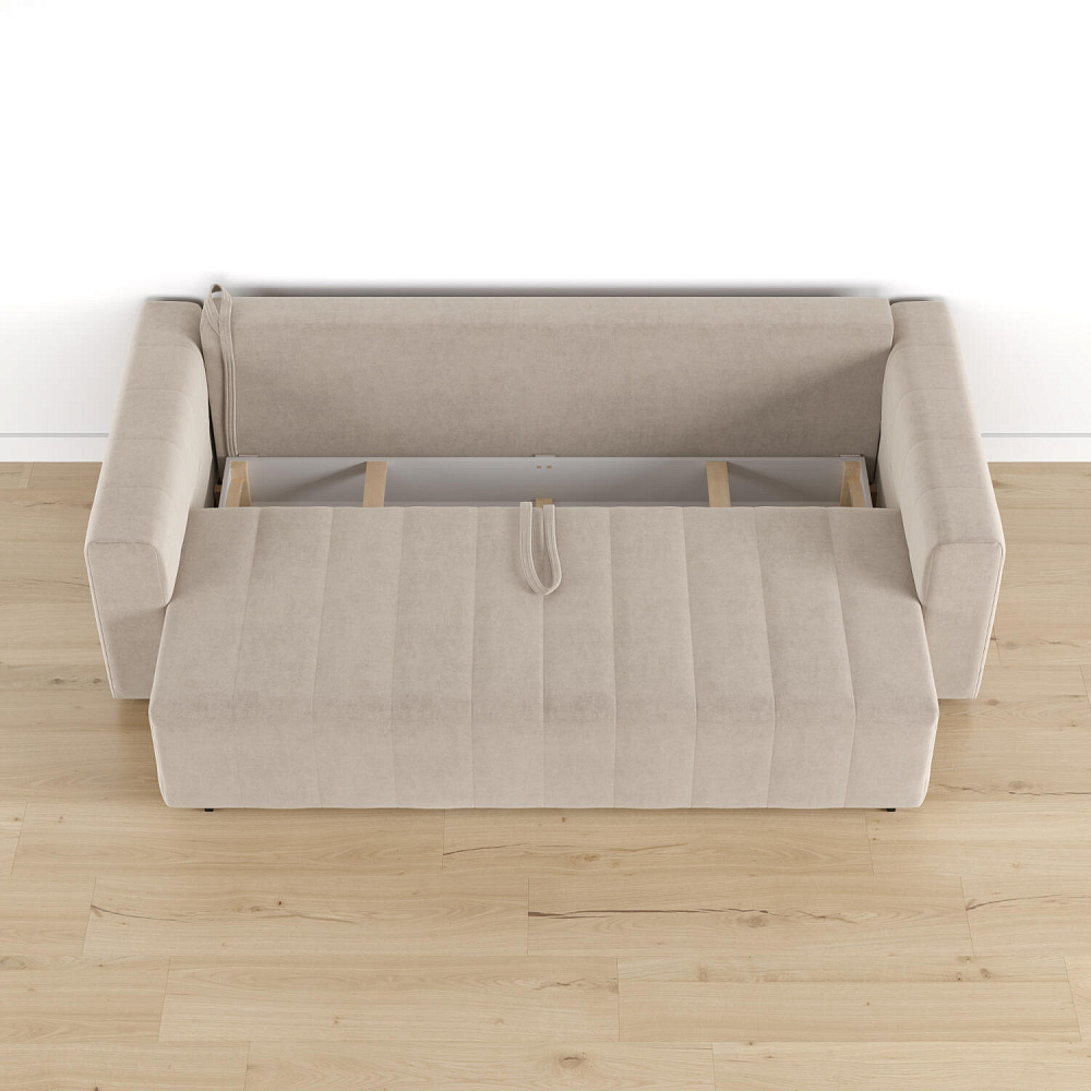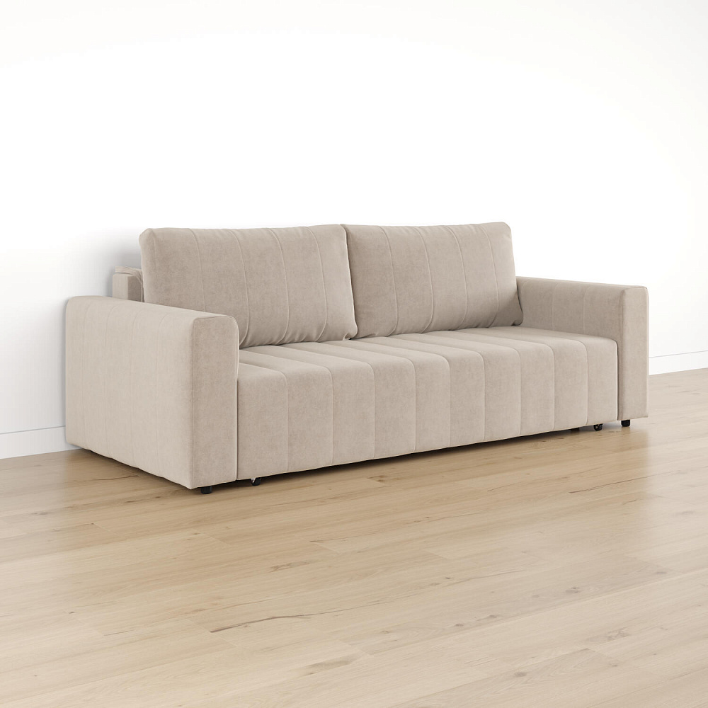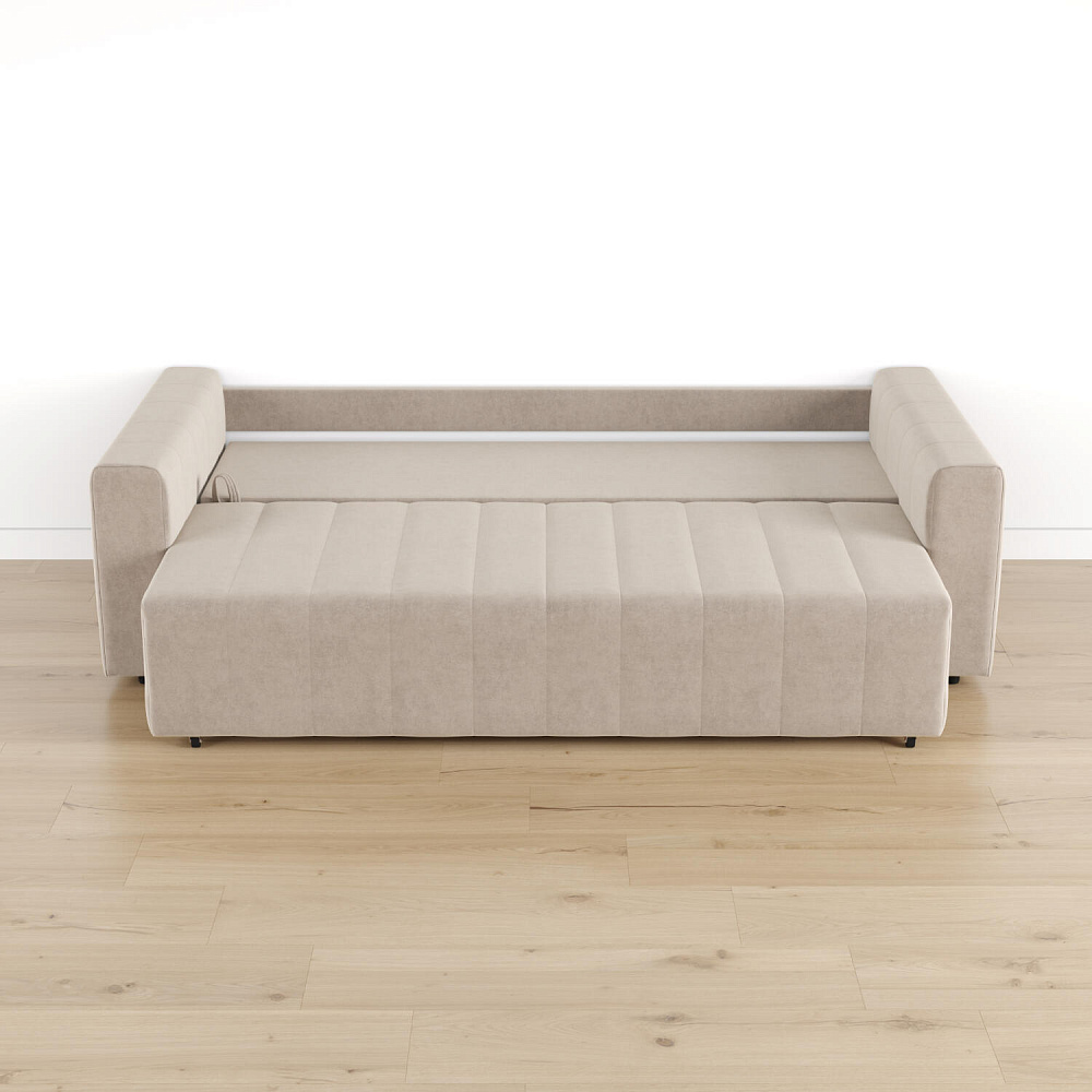 Механизм трансформации «Еврокнижка». Диван легко раскладывается — нужно выкатить вперед сиденье и опустить спинку. Удобен механизм ещё тем, что двигается только передняя часть, поэтому отодвигать диван от стены не требуется.