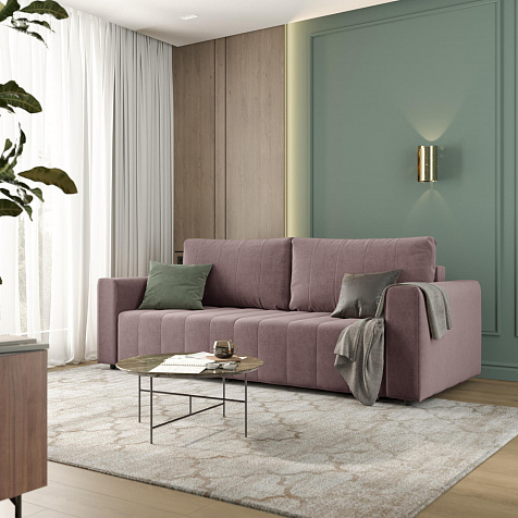 Механизм трансформации «Еврокнижка». Диван легко раскладывается — нужно выкатить вперед сиденье и опустить спинку. Удобен механизм ещё тем, что двигается только передняя часть, поэтому отодвигать диван от стены не требуется.
