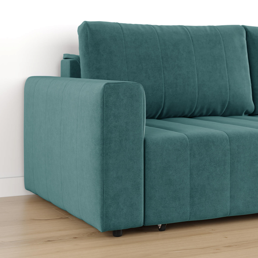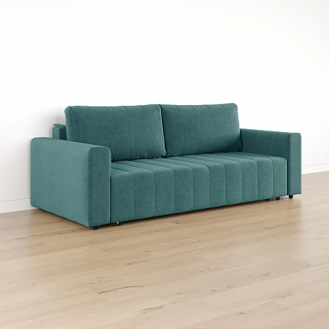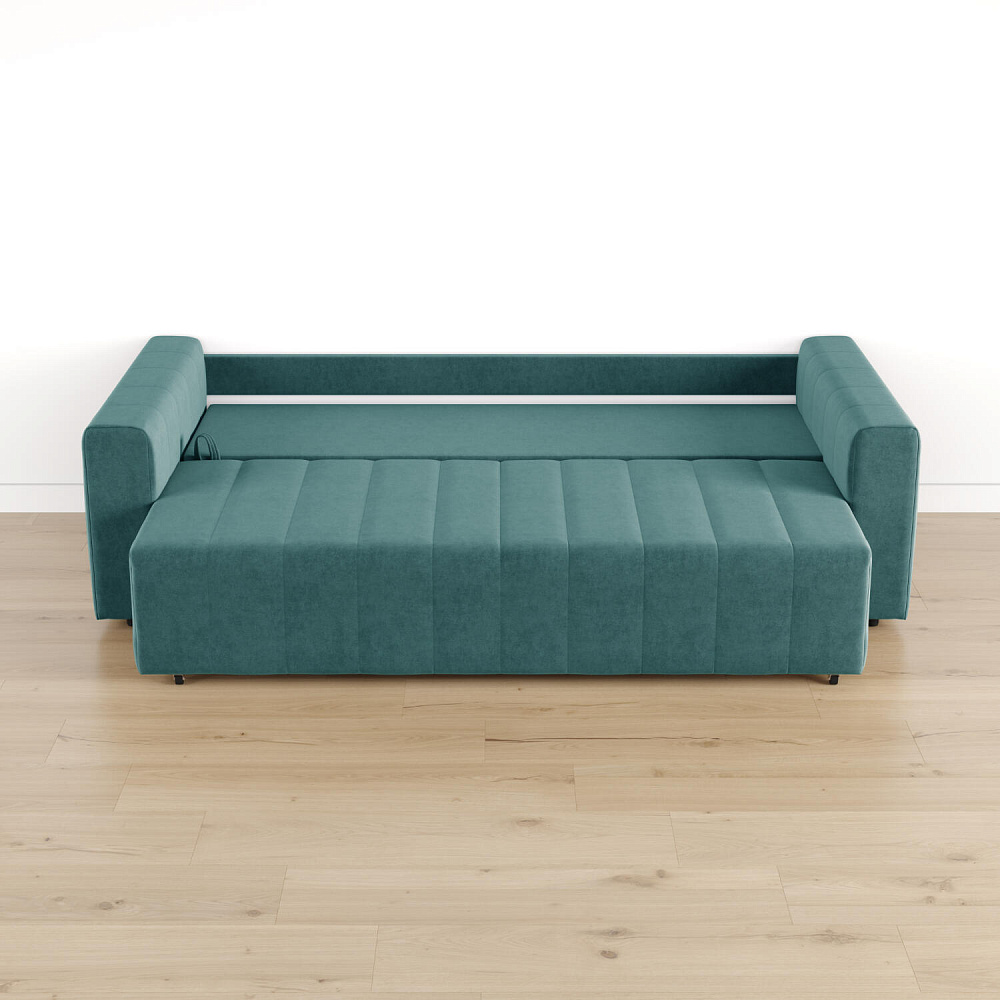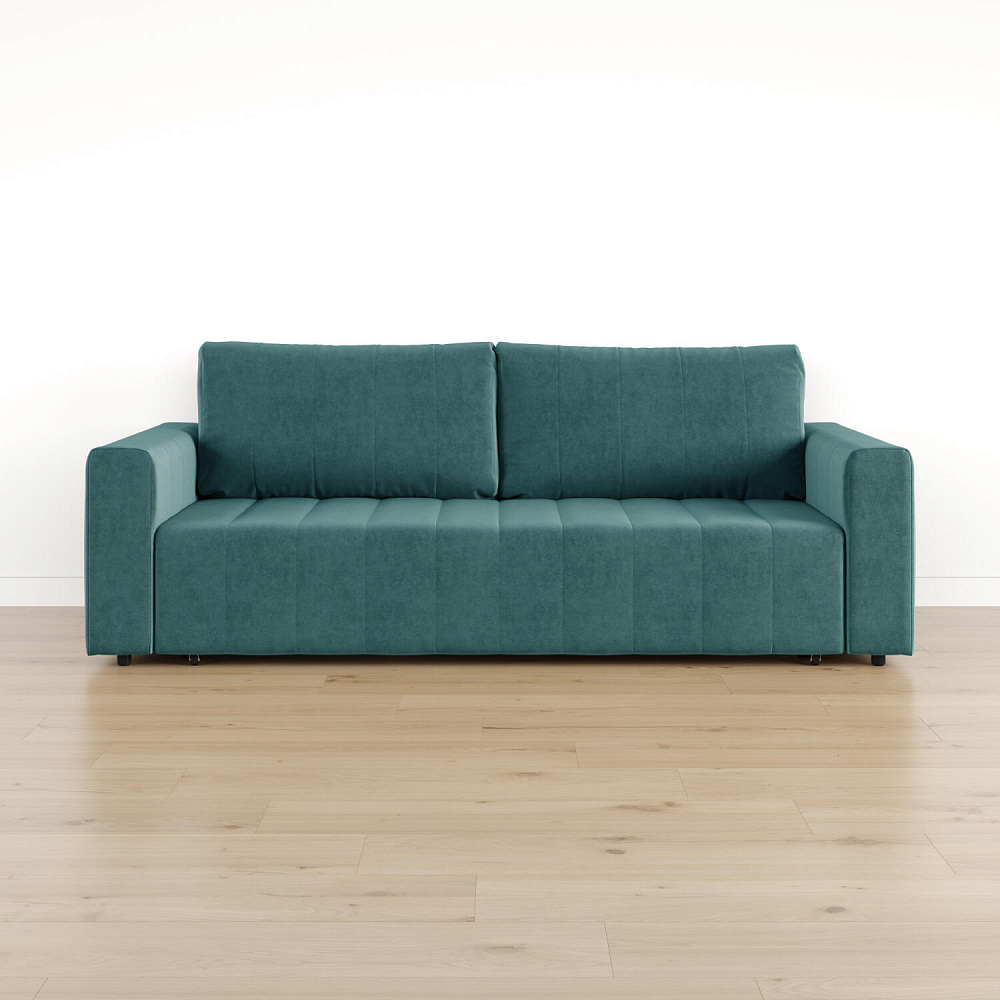 Механизм трансформации «Еврокнижка». Диван легко раскладывается — нужно выкатить вперед сиденье и опустить спинку. Удобен механизм ещё тем, что двигается только передняя часть, поэтому отодвигать диван от стены не требуется.