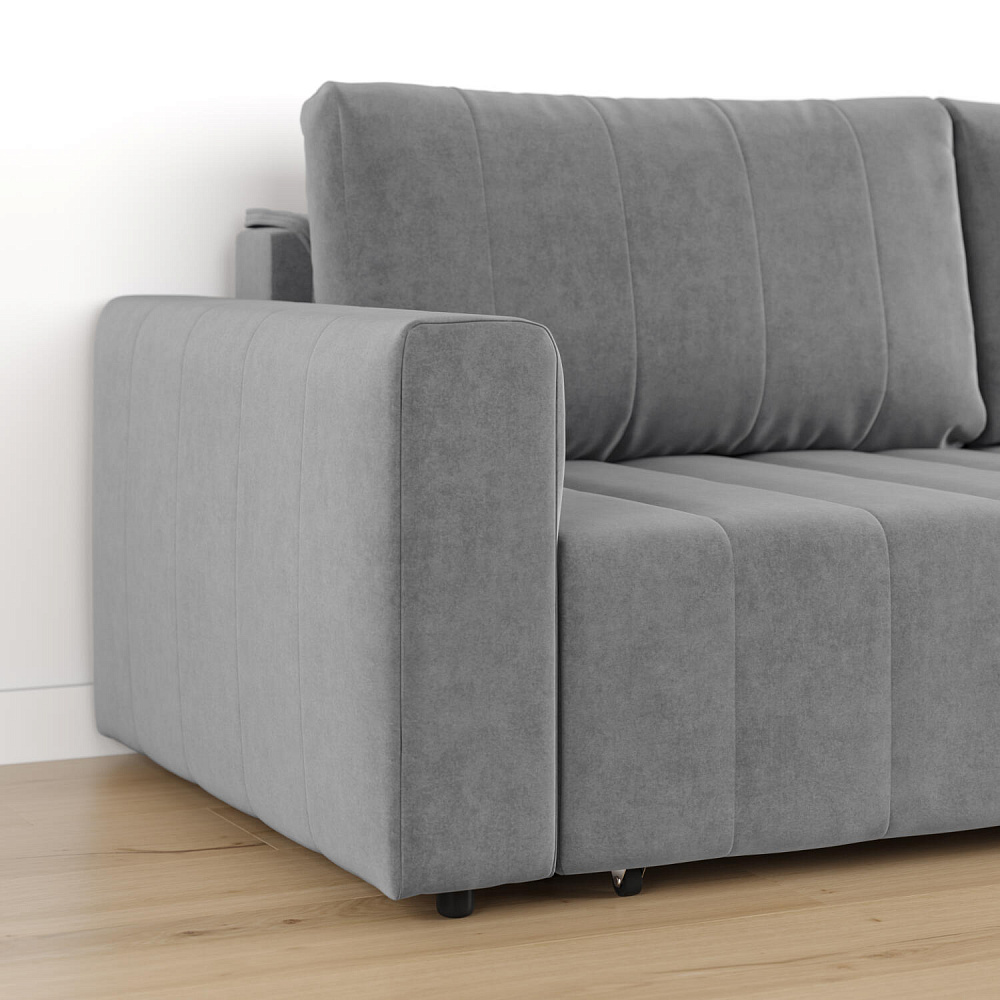 Механизм трансформации «Еврокнижка». Диван легко раскладывается — нужно выкатить вперед сиденье и опустить спинку. Удобен механизм ещё тем, что двигается только передняя часть, поэтому отодвигать диван от стены не требуется.