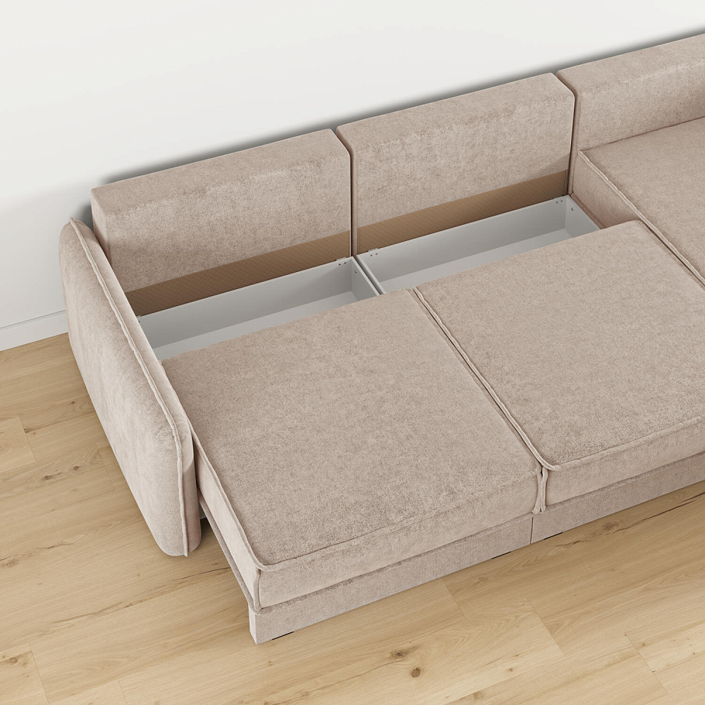 - Три короба для белья. В каждой секции и оттоманке предусмотрен вместительный короб для хранения постельного белья и других вещей.