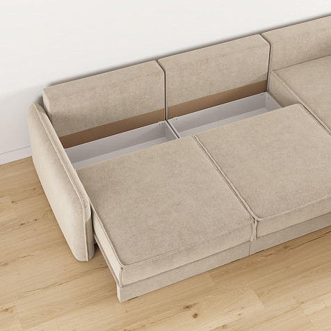 - Три короба для белья. В диванных секциях предусмотрены вместительные коробы для хранения постельного белья и других вещей.