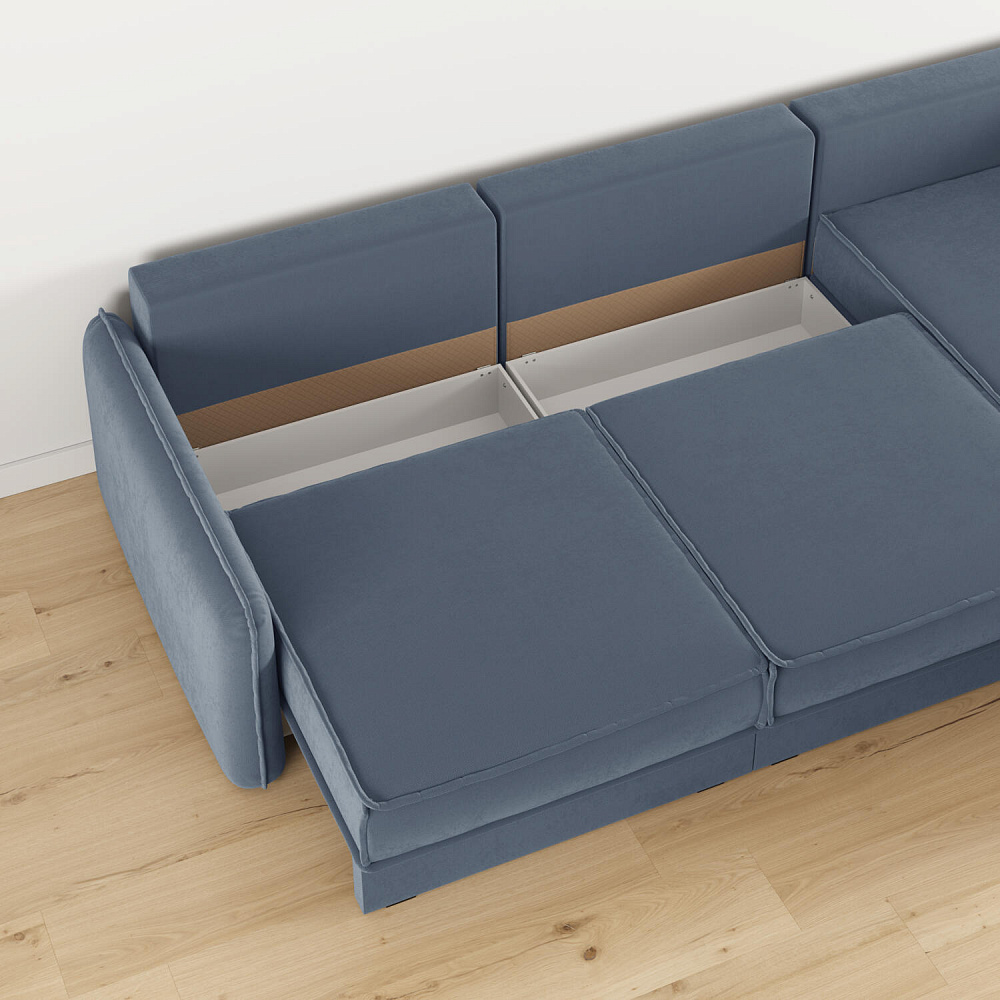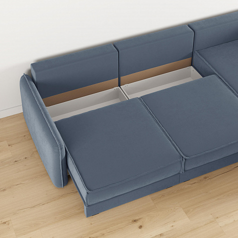 - Три короба для белья. В диванных секциях предусмотрены вместительные коробы для хранения постельного белья и других вещей.