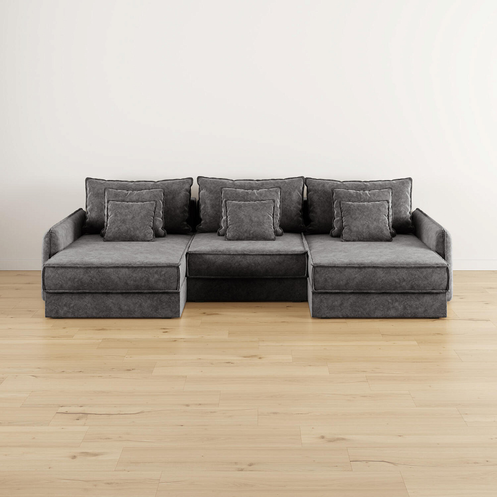 - 9 подушек в комплекте. 3 приспинных и 6 декоративных подушек разных размеров позволят скорректировать глубину посадки.