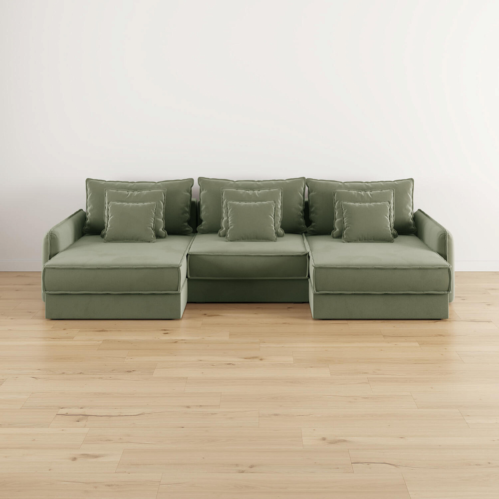 - 9 подушек в комплекте. 3 приспинных и 6 декоративных подушек разных размеров позволят скорректировать глубину посадки.