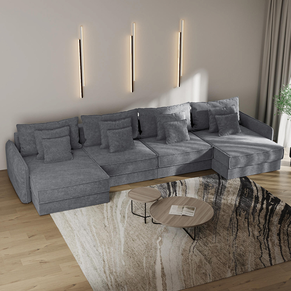 - 12 подушек в комплекте. 4 приспинных и 8 декоративных подушек разных размеров позволят скорректировать глубину посадки.