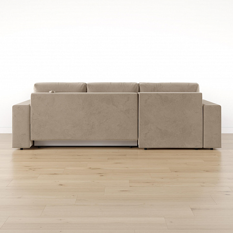 Задняя сторона спинки в обивочной ткани. Диван подойдет для зонирования помещения или расположения в центре комнаты.