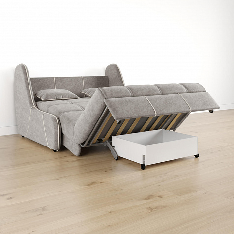 Механизм трансформации «Аккордеон». Чтобы разложить диван, необходимо приподнять сиденье и слегка потянуть на себя. В таком виде диван представляет собой единую конструкцию без петель и швов, которая обеспечит непревзойдённо комфортный сон. Для лёгкого раскладывания механизм усилен газовыми амортизаторами, а прорезиненные ролики защищают напольное покрытие от истирания.