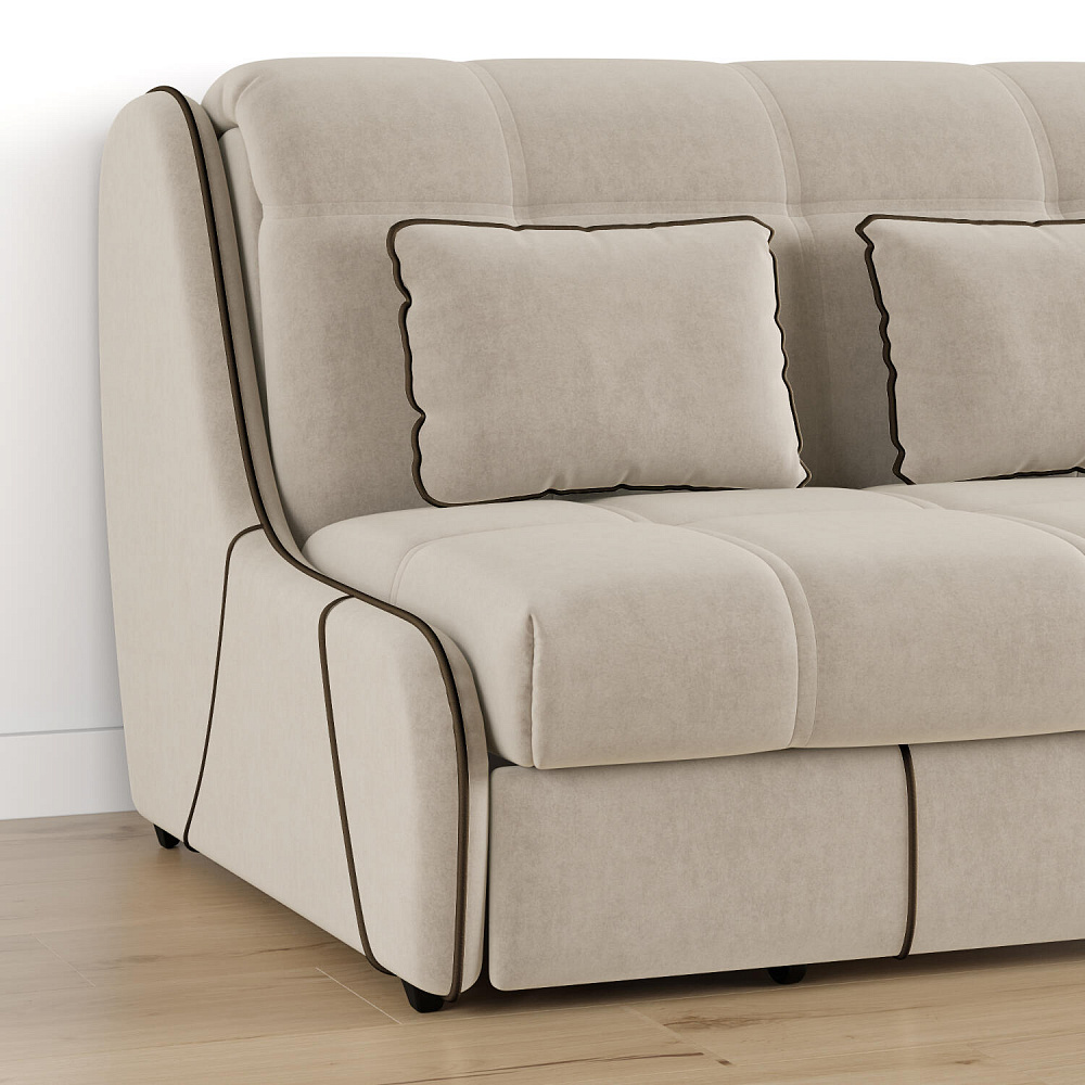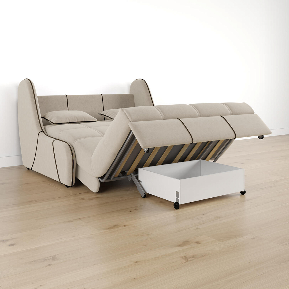 Механизм трансформации «Аккордеон». Чтобы разложить диван, необходимо приподнять сиденье и слегка потянуть на себя. В таком виде диван представляет собой единую конструкцию без петель и швов, которая обеспечит непревзойдённо комфортный сон. Для лёгкого раскладывания механизм усилен газовыми амортизаторами, а прорезиненные ролики защищают напольное покрытие от истирания.