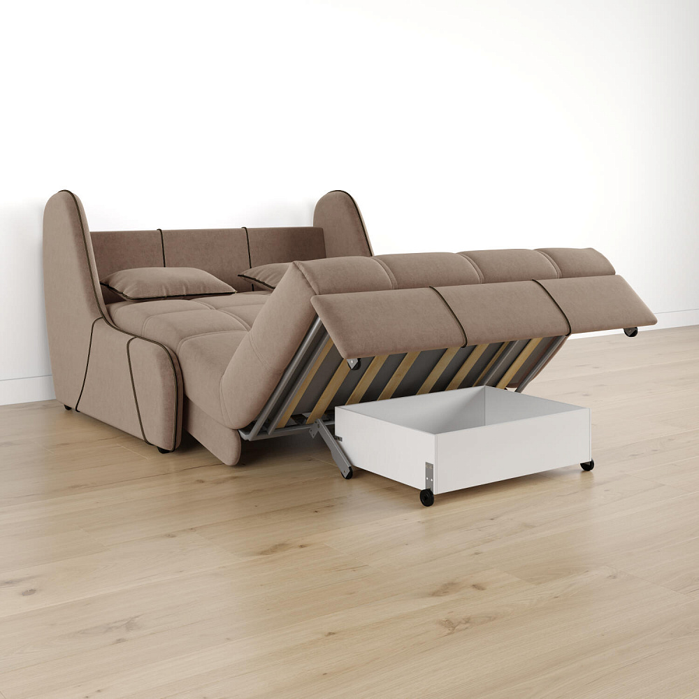 Механизм трансформации «Аккордеон». Чтобы разложить диван, необходимо приподнять сиденье и слегка потянуть на себя. В таком виде диван представляет собой единую конструкцию без петель и швов, которая обеспечит непревзойдённо комфортный сон. Для лёгкого раскладывания механизм усилен газовыми амортизаторами, а прорезиненные ролики защищают напольное покрытие от истирания.