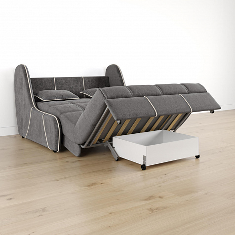 Механизм трансформации «Аккордеон». Чтобы разложить диван, необходимо приподнять сиденье и слегка потянуть на себя. В таком виде диван представляет собой единую конструкцию без петель и швов, которая обеспечит непревзойдённо комфортный сон. Для лёгкого раскладывания механизм усилен газовыми амортизаторами, а прорезиненные ролики защищают напольное покрытие от истирания.