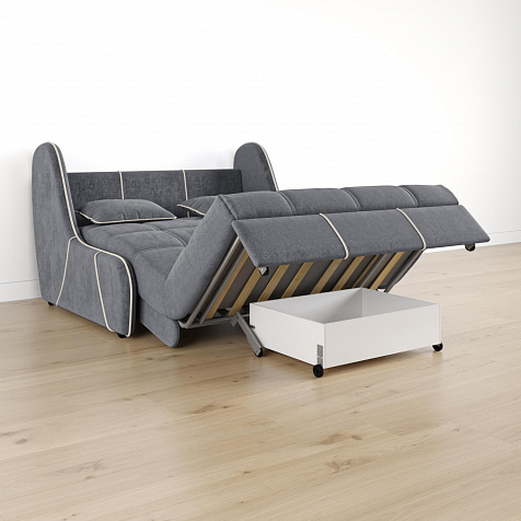 Механизм трансформации «Аккордеон». Чтобы разложить диван, необходимо приподнять сиденье и слегка потянуть на себя. В таком виде диван представляет собой единую конструкцию без петель и швов, которая обеспечит непревзойдённо комфортный сон. Для лёгкого раскладывания механизм усилен газовыми амортизаторами, а прорезиненные ролики защищают напольное покрытие от истирания.