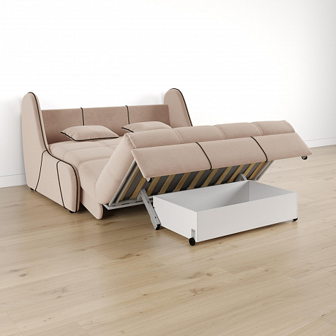Механизм трансформации «Аккордеон». Чтобы разложить диван, необходимо приподнять сиденье и слегка потянуть на себя. В таком виде диван представляет собой единую конструкцию без петель и швов, которая обеспечит непревзойдённо комфортный сон. Для лёгкого раскладывания механизм усилен газовыми амортизаторами, а прорезиненные ролики защищают напольное покрытие от истирания.
