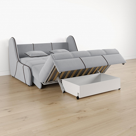 Механизм трансформации «Аккордеон». Чтобы разложить диван, необходимо приподнять сиденье и слегка потянуть на себя. В таком виде диван представляет собой единую конструкцию без петель и швов, которая обеспечит непревзойдённо комфортный сон. Для лёгкого раскладывания механизм усилен газовыми амортизаторами, а прорезиненные ролики защищают напольное покрытие от истирания.