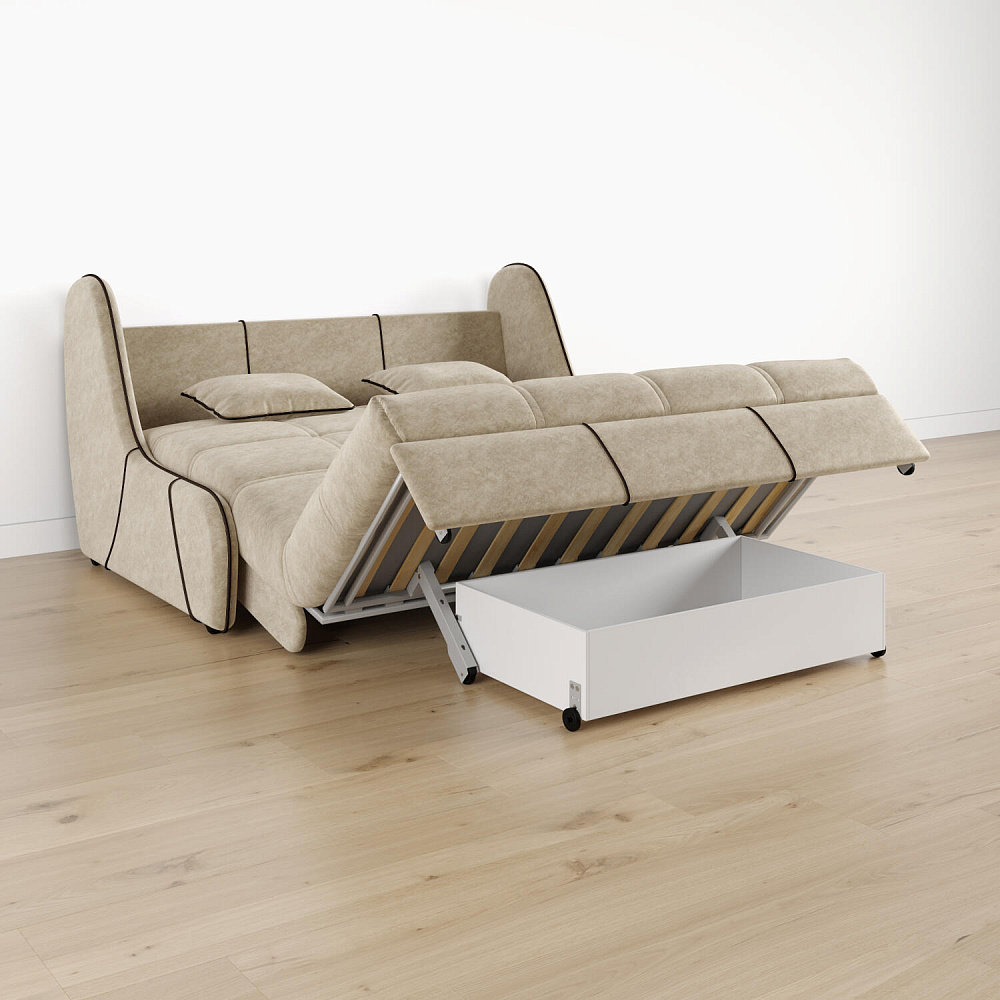 Механизм трансформации «Аккордеон». Чтобы разложить диван, необходимо приподнять сиденье и слегка потянуть на себя. В таком виде диван представляет собой единую конструкцию без петель и швов, которая обеспечит непревзойдённо комфортный сон. Для лёгкого раскладывания механизм усилен газовыми амортизаторами, а прорезиненные ролики защищают напольное покрытие от истирания.