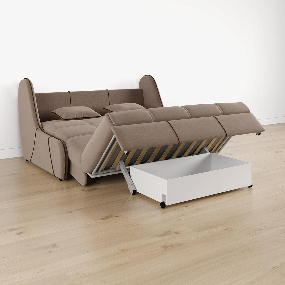 Механизм трансформации «Аккордеон». Чтобы разложить диван, необходимо приподнять сиденье и слегка потянуть на себя. В таком виде диван представляет собой единую конструкцию без петель и швов, которая обеспечит непревзойдённо комфортный сон. Для лёгкого раскладывания механизм усилен газовыми амортизаторами, а прорезиненные ролики защищают напольное покрытие от истирания.