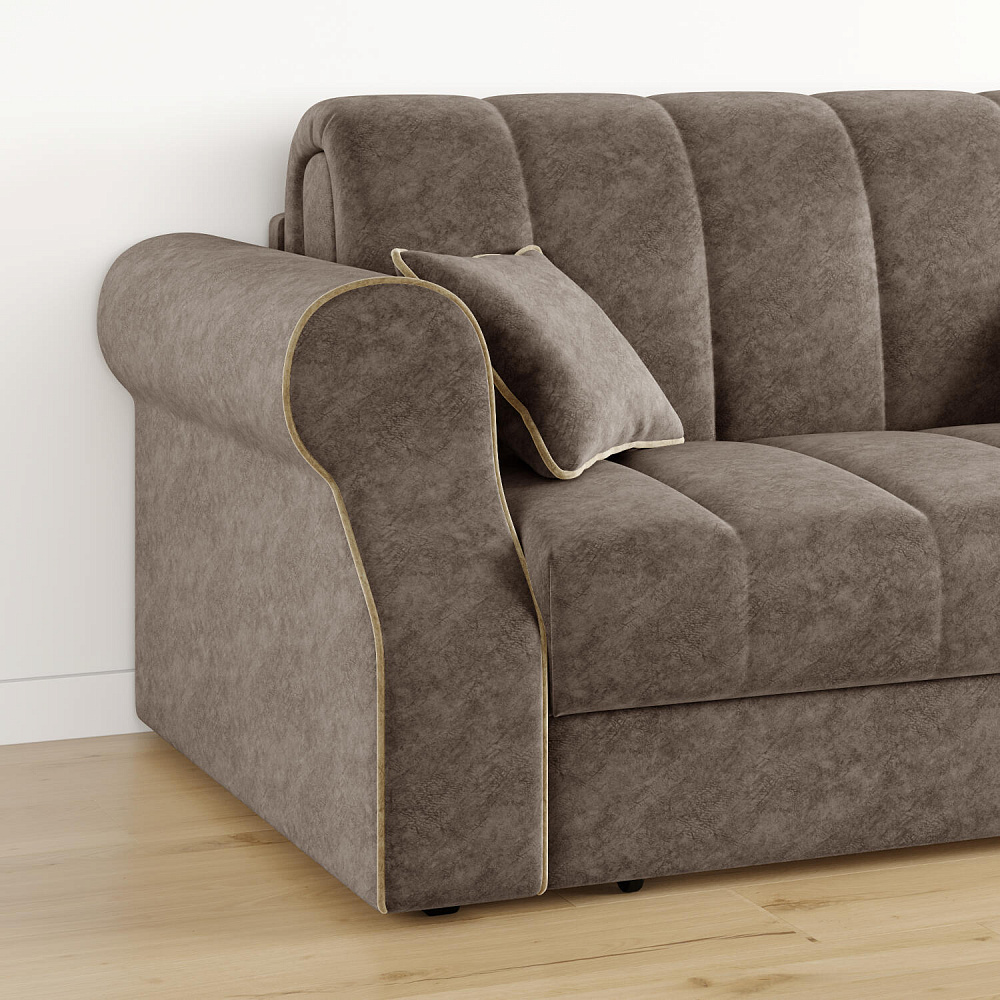 Механизм трансформации «Аккордеон». Чтобы разложить диван, необходимо приподнять сиденье и слегка потянуть на себя, далее диван разложится сам. В таком виде диван представляет собой единую конструкцию без петель и швов, которая обеспечит непревзойдённо комфортный сон. Для лёгкого разложения механизм усилен газовыми амортизаторами, а прорезиненные ролики защитят напольное покрытие от истирания.