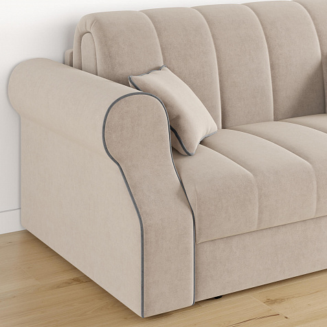 Механизм трансформации «Аккордеон». Чтобы разложить диван, необходимо приподнять сиденье и слегка потянуть на себя, далее диван разложится сам. В таком виде диван представляет собой единую конструкцию без петель и швов, которая обеспечит непревзойдённо комфортный сон. Для лёгкого разложения механизм усилен газовыми амортизаторами, а прорезиненные ролики защитят напольное покрытие от истирания.