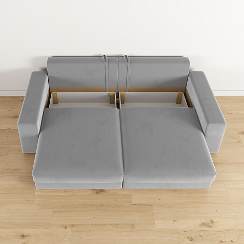 Механизм двухсекционная «Еврокнижка». Трансформация дивана с таким механизмом проводится в несколько действий: необходимо потянуть сиденье каждой секции на себя, пока не откроется доступ к коробу для белья. Затем нужно опустить задние части дивана.