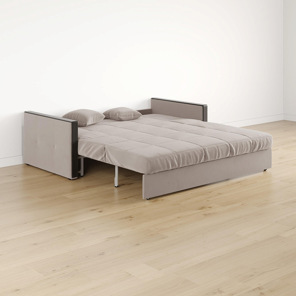 Механизм трансформации «Аккордеон». Чтобы разложить диван, необходимо приподнять сиденье и слегка потянуть на себя, далее диван разложится сам. Поверхность спального места ровная, без петель и швов, поэтому сон будет приятным и комфортным. Прорезиненные ролики защитят напольное покрытие от истирания.