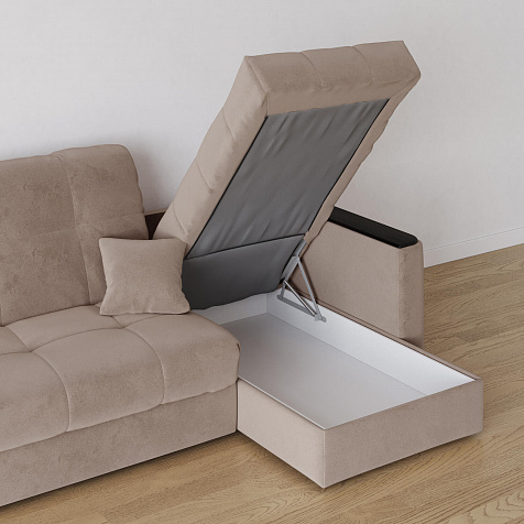 - Короб для белья. В оттоманке дивана скрыт просторный бельевой ящик, в котором можно разместить все необходимые постельные принадлежности.